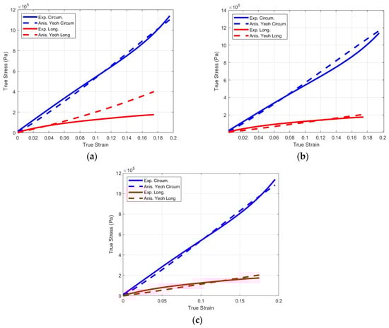 Table 3 indicates that the GA and Pareto results suggest that the fibers were almost normal to each other and aligned with the circumferential and longitudinal directions. Comparing , , and showed that the circumferential fibers dominated the corresponding coefficients of the Yeoh hyperplastic model and the longitudinal fibers. Similarly, the coefficients of the higher-order terms, , , and , were significantly smaller. However, removing them from the model reduced its accuracy.
