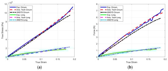 Figure 12a,b compare the true stress and reaction forces of the experiment, constitutive model, and finite element in the circumferential and longitudinal directions, respectively. The reported FEM stresses correspond to the average for elements at the midsection of the specimen while the force was recorded at the fixed support. Table 4 lists the normalized errors of the proposed constitutive model with respect to the experimental circumferential and longitudinal stress–strain curves.