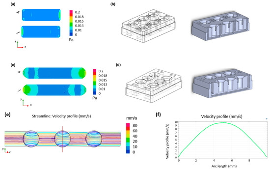 CFD simulations of the designed device. Two-dimensional shear stress distribution within (a) the single well format channel with (b) relative geometry and (c) the connected well format channel with (d) relative geometry during the oscillatory rocking movement at ±7°. (e) Two-dimensional velocity distribution across the channel and (f) velocity profile across the width of the chamber (red line in (e)) for a shear stress of 0.02 Pa.
