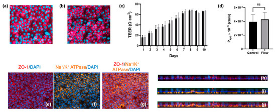 Barrier formation and integrity is comparable for aProximate cells grown under static and FSS conditions. (a,b) Tigh junction formation under static and flow condition, respectively; (c) TEER was monitored daily for 10 days for cells grown under static (black) and FSS (grey) conditions (data expressed as mean ± SD; representative experiment shown (n = 6)); (d) Apparent permeability (Papp) was assessed using Lucifer Yellow up to 180 min on day 10 (data expressed as mean ± SEM; n = 6). Polarization and relative orthogonal projections confirm the apical localization of (e,h) tight junction formation (red) and (f,i) the basolateral localization of Na+/K+ adenosine triphosphatase (orange) for cells under FSS conditions; (g) Merged image of (e,f) and (j) merged image of (h,i).