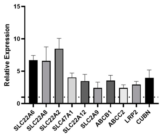 We assessed the expression of ten key transporters in hPTCs after seven days culture under static or FSS conditions in the aProximate MPS Flow system. We noted that all ten transporters were upregulated under flow: SLC22A6 (OAT1), SLC22A8 (OAT3), SLC22A2 (OCT2), SLC47A1 (MATE1), SLC22A12 (URAT1), SLC2A9 (GLUT9), ABCB1 (MDR1), ABCC2 (MRP2), LRP2 (megalin), and CUBN (cubilin) (Figure 4).