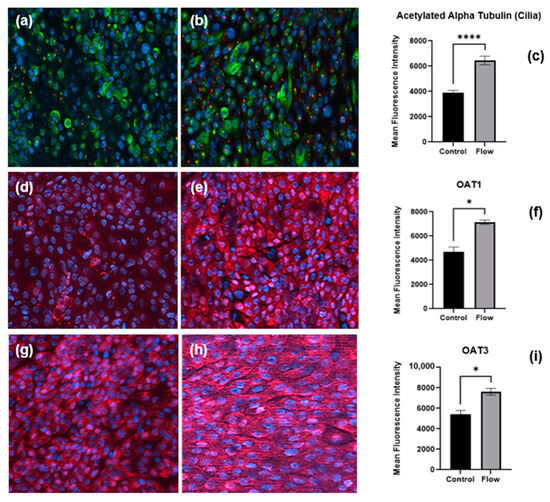 Immunofluorescence staining of proteins, cilia, and transporters of PTCs in static and flow conditions after seven days of culture. Staining of pericentrin (red) and acetylated α-tubulin (green) to visualize primary cilia in (a) static versus (b) flow conditions. Organic anion transporters expression (red) under static (d,g) and FSS (e,h) conditions, respectively. Quantitative analysis of mean fluorescence intensity of cilia (c), OAT1 (f), and OAT3 (i) (flow and control conditions were compared using Student’s t-test, **** p < 0.0001, * p < 0.05).