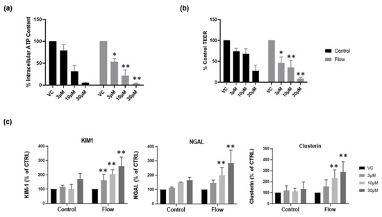 Cells grown under flow are more sensitive to nephrotoxic insult. Following seven days’ culture under static or FSS conditions, cells were exposed to cisplatin for 72 h. (a) ATP release and (b) TEER at day 10 in both static (black) and flow (grey) conditions; (c) renal stress biomarker release at day 10 (mean ± S; n = 4; flow and control conditions were compared using two-way ANOVA followed by Šídák’s multiple comparisons test * p < 0.05, ** p < 0.005). VC, vehicle control.