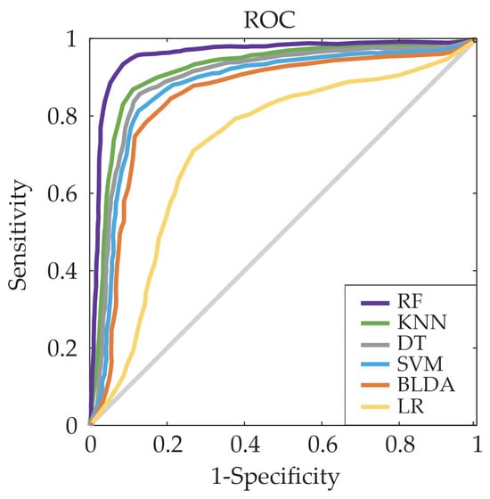The algorithm was designed and developed using Matlab software (MatLab 2023a, The Mathworks Inc., Natick, MA, USA). Furthermore, the proposed system underwent analysis alongside other ML systems prevalent in the scientific community. These included Support Vector Machine (SVM) [14], Binary Linear Discriminant Analysis (BLDA) [26], Decision Trees (DT) [15], Linear Regression (LR) [27,28], and k-Nearest Neighbor (KNN) [16] to assess its performance. Within the ML system’s learning process, it is imperative to control overtraining. To address this, the k-fold cross-validation technique was employed in our case.