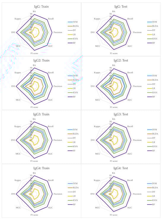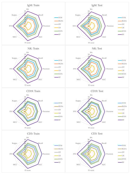 Moreover, Table 4 and Table 5 present performance metrics, including F1 score, MCC, DYI, and Kappa values, for the ML methods applied. The observed values provide insights into the models’ effectiveness in classifying SLE patients. Thus, in Table 4 (variables IgG, IgG2, IgG3, and IgG4), RF consistently outperforms again other methods across all metrics, exhibiting high F1 score, MCC, DYI, and Kappa values. This suggests RF’s robustness in achieving a balanced trade-off between precision and recall, capturing the model’s ability to handle both positive and negative instances effectively. Again, KNN also shows competitive performance, while SVM, BLDA, and DT demonstrate slightly lower performance across these metrics, being LR the one which obtained the lowest performance values. Similar trends are observed in the variables related to immune cell types in Table 5 (IgM, NK, CD19, and CD3), where RF again demonstrates superior performance, especially notable in achieving high F1 score and DYI values. This reinforces RF’s suitability for SLE classification, indicating its ability to maintain a balance between true positives, true negatives, false positives, and false negatives. KNN also perform well, but RF consistently stands out as the top-performing model across the diverse set of variables.