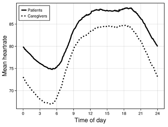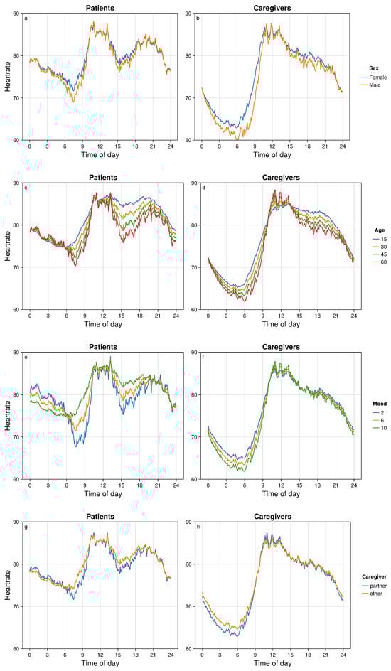 It is well-established that males have lower resting HR than females, and that resting HR decreases with age [24,25,26,27]. These are consistent with Figure 5a,b for sex differences, and Figure 5c,d for age differences. Self-reported mood was a predictor of HR trajectories (Figure 5e,f), especially for patients for whom a higher mood score corresponded to an earlier and higher HR nadir, and higher tonic HR during the afternoon. Differences associated with caregiver type (partner versus non-partner) were not statistically significant (Figure 5g,h).