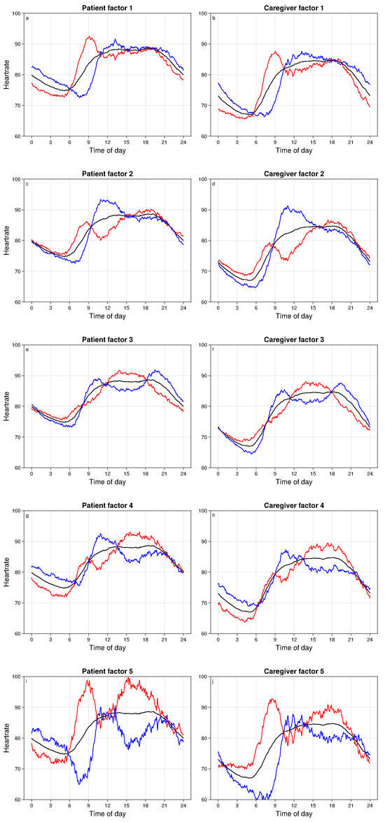 Several of the factors capture differences in the overnight HR levels. Patients with high scores on factors 1, 4, and 5 all have lower overnight HR, as do caregivers with high scores on factors 1 and 4. Both patients and caregivers with low scores on factors 2 and 3 have lower overnight HR, especially near the nadir.