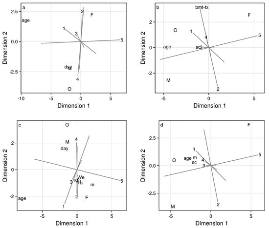 Biplots depicting regression coefficients for each factor for patients (a,c) and caregivers (b,d), for the base model (a,b) and the model including mood (c,d). Variables are abbreviated as I (intervention), F (female), M (male), m (mood), ss (season sine), sc (season cosine), and O (onc cohort). Numbers correspond to the positive end of each projected axis.