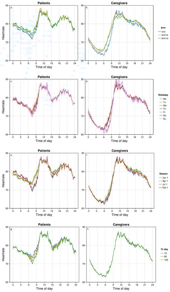There was no strong statistical evidence for a difference between the BMT treatment arms, but the Oncology study cohort had a lower HR nadir (Figure 6a,b). Weekends, in comparison to weekdays, had later HR nadirs at lower HR levels (Figure 6c,d), especially for caregivers. During fall/winter, the HR nadir for patients appears later in the morning and at a lower HR (Figure 6e,f). This is plausibly related to the fact that nearly all of the patients were residing in locations with much less sunlight during fall/winter. Days since treatment initiation was associated with HR for patients, but not for caregivers. The more time that has passed since treatment initiation, the later and lower is the HR nadir for patients (Figure 6g).