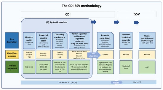 The CDI-SSV Methodology: An Integrated Approach for Clustering Validation. The figure provides an overview of the Clustering, Distance measures, and Iterative Statistical and Semantic Validation (CDI-SSV) methodology. The CDI phase serves as the initial step, involving the evaluation of cluster quality, the impact of different starting seeds, and the consistency of clusters across various algorithms and pre-defined values of k. Within- and between-consistency checks, along with evaluations of internal semantic consistency, are performed to assess the optimal algorithm and values of k. In the subsequent SSV phase, an external semantic analysis of the results is conducted, with a particular focus on the clinical context, thus enhancing the validation process. Finally, machine learning techniques are employed to validate the results, and their interpretation is facilitated by SHAP (Shapley additive explanations) values.