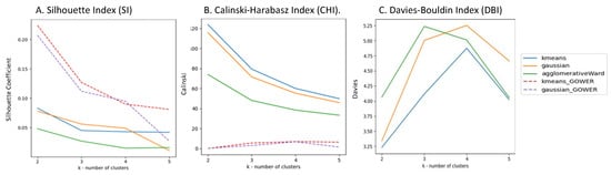 To assess the robustness and stability of the clustering algorithms under various conditions, we employed several approaches [38,39,40]. We computed three evaluation distance measures metrics (the SI, CHI, and DBI) for each algorithm (K-means, Gaussian mixture, and agglomerative clustering using all four linkage methods), and for each value of k, with and without the use of Gower’s distance metric. This allowed us to compare the performance of the different algorithms and examine the impact of the number of clusters (k) on the quality metrics.