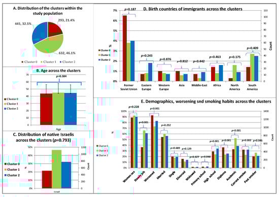 No statistically significant associations were found between any specific cluster and the following demographic characteristics: age (p = 0.384, Figure 3B), sex (p = 0.228, Figure 3E), being native Israeli (p = 0.793, Figure 3C), being born in any other immigrant countries (Figure 3D), and marital status (Figure 3E). However, significant differences were observed among the clusters in relation to other factors. As depicted in Figure 3E, Cluster 1 reflected the least severe condition, Cluster 0 reflected the worst, and Cluster 2 fell in between. The following comparisons showed statistically significant differences among the clusters: having a steady job (p < 0.001), reporting a worsening of fibromyalgia in the last year (p < 0.001), and current smoking status (p < 0.001). Cluster 0 had the highest prevalence among those with a high school education (p = 0.001) and diploma education (postgraduate qualification after high school, but not an academic degree) (p < 0.001).