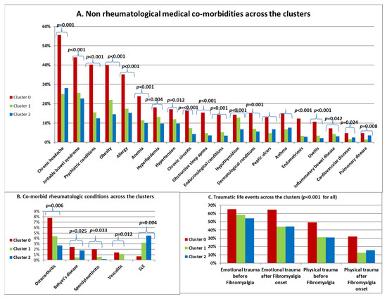 The distribution of comorbidities and trauma history across the clusters are presented in Figure 4. Cluster 0 had a significantly higher prevalence of all analyzed systemic diseases (Figure 4A), as well as of rheumatological conditions, except for systemic lupus erythematosus (SLE), where it showed a significantly lower prevalence (Figure 4B). Additionally, Cluster 0 exhibited a higher number of emotional and physical traumatic life events both before and after the onset of fibromyalgia (Figure 4C). There were no statistically significant differences observed between the three clusters regarding the presence of certain systemic comorbidities, including malignancy (p = 0.619), hyperthyroidism (p = 0.194), liver disease (p = 0.086), and kidney disease (p = 0.921). Similarly, no significant differences were found among the clusters for various comorbid rheumatological conditions, including rheumatoid arthritis (p = 0.209), Sjögren syndrome (p = 0.977), Ankylosing spondylitis (p = 0.155), psoriatic arthritis (p = 0.073), familial mediterranean fever (p = 0.587), scleroderma (p = 0.307), gout (p = 0.074), and pseudogout (p = 0.214); these non-significant findings are not shown in the figures.