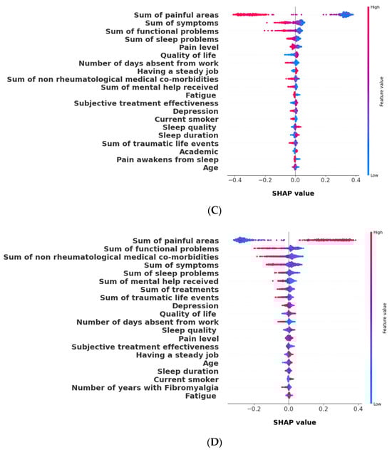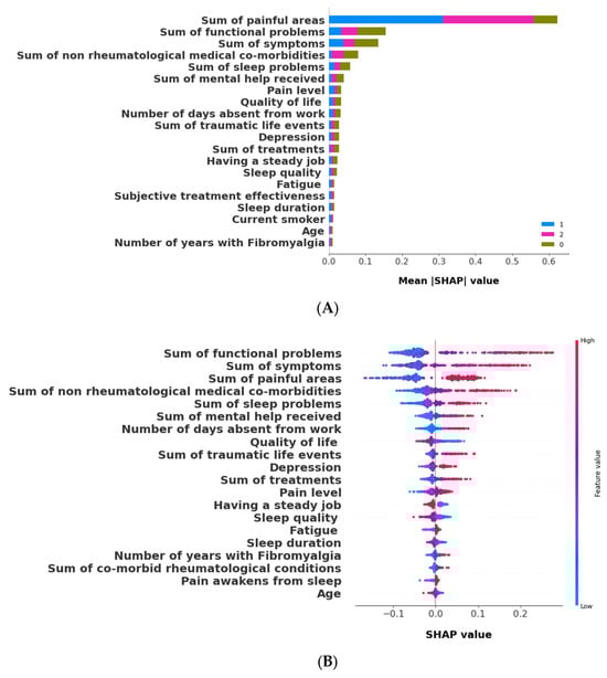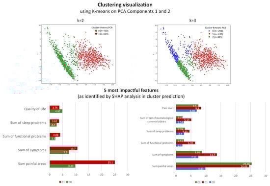 To validate the clusters identified, we used a random forest model to predict the cluster assignments for each patient. For this model, we utilized the default parameters as implemented in the scikit-learn (sklearn) library in Python. This machine learning approach was chosen for its robustness and ability to handle complex, multi-dimensional data. Further, to understand which features most influenced these predictions, we utilized SHAP values. SHAP values provide insights into the contribution of each feature to the prediction made by the model, thereby clarifying which features are most influential in defining each cluster, enhancing the interpretation of the clustering results. To facilitate this computation, we utilized the TreeExplainer method, designed for tree-based models [37,38]; like random forest, this method allows for an efficient and accurate interpretation of the model’s output. Moreover, to enhance interpretability, we grouped features into aggregative sums, enabling us to analyze the collective impact of related features on the clustering, providing a more holistic view of the factors that differentiated the patient clusters.