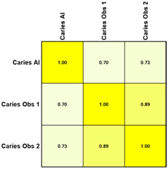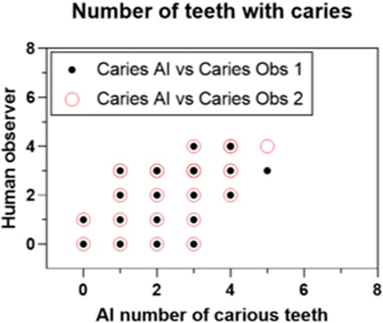 CNNs have been primarily employed to create AI-based systems for caries detection, as they can take images as inputs and produce image identification and classification as outputs. A systematic review reported that the accuracy of AI-based models in predicting caries ranges from 83.6% to 97.1% across various studies. Moreover, AI support for dentists in detecting enamel caries led to a substantial improvement, with detection rates increasing from 44.3% to 75.8% [,]. The present study also found a strong correlation in caries detection between the AI and the two human observers, with Pearson correlation coefficients of R = 0.7 with observer 1 and R = 0.73 with observer 2. It is important to note that early caries detection is fundamental for preserving tooth tissues, delaying restorative interventions, reducing expensive restorative treatments, and retaining teeth long-term, and can be sometimes missed by inexperienced clinicians [,]. In a study performed by Garcia Cantu et al., it was concluded that the trained neural network outperformed most dentists in accurately detecting caries lesions on bitewings, particularly for initial lesions. Moreover, while dentists tended to under-detect lesions, the neural network slightly over-detected them []. However, they compared the efficiency of AI against experienced general dentists, rather than oral and maxillofacial radiologists, who are the experts in interpreting these radiographs, as was performed in our study.