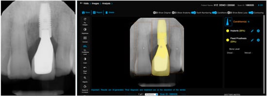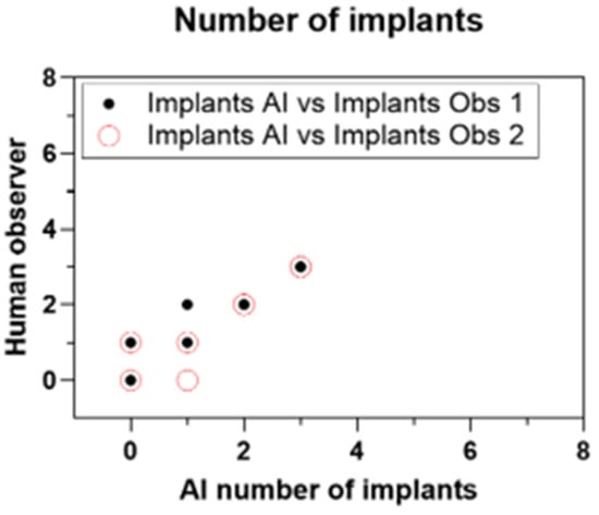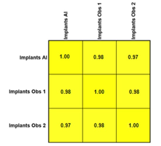 The application of convolutional neural networks for identifying dental implants is a well-explored area within AI and implantology, where multiple studies have shown promising results in detecting dental implants in both panoramic and periapical radiographs []. These outcomes are consistent with our findings, where the AI demonstrated the highest agreement with the two human observers in identifying the number of dental implants (R = 0.97–0.98). These results could offer valuable assistance to dentists in identifying implants in instances when the patient does not recall having a dental implant placed, or its location within the oral cavity. Dental implants have become increasingly popular, as it is a permanent way to restore function after losing a tooth. Along with this trend, more types and options have become available in the market, most of them with different shapes, sizes, and overall architectures. By using deep learning algorithms, it is now possible to determine not only its presence, but also identify the implant’s brand [,]. However, the studies published in the scientific literature often used a limited number of brands, leaving out many systems available on the market, mainly due to the large number of radiographs needed to train the machine, making this task extremely difficult to achieve.