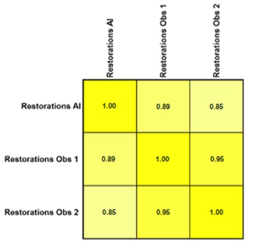 Diagnosing various types of restorations might be straightforward for expert clinicians but challenging for less experienced dentists. Detecting tooth-colored restorations through visual inspection can be difficult at times, regardless of a clinician’s expertise. A study employing a CNN achieved promising results in detecting metallic restorations, with a sensitivity of 85.48%, whereas the sensitivity for detecting composite resin restorations was 41.11% in panoramic radiographs. However, they observed that the AI-based software showed higher detection errors for resin-based restorations in cases where even the operators had difficulty identifying them []. A study conducted by Abdalla-Aslan et al. found 100% and 83.1% sensitivity to detect amalgam and composite fillings, respectively, using AI in panoramic radiographs []. It is important to consider that periapical radiographs have higher spatial resolution compared to panoramic radiographs, making restoration detection and recognition more reliable. The present study found a strong correlation between the CNN and the two human observers, with correlation coefficients ranging from R = 0.85 to R = 0.89. These results underscore the potential for using CNNs in diagnosing and planning treatments for patients, educating students, and practising forensic dentistry.