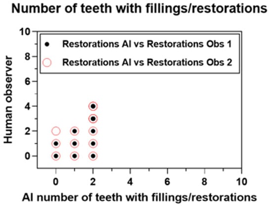 Image annotation: Five hundred anonymized periapical dental radiographs were analyzed and labeled by two independent oral and maxillofacial radiologists, each with a minimum of five years of experience. The two radiologists underwent the same calibration process and had comparable years of experience prior to participating in the study. The specialists independently identified and detected teeth, caries (including all types such as enamel, dentin, secondary, root, etc.), implants, restorations (amalgam and composites), and fixed prostheses. The radiographs were labeled to highlight the number of teeth with caries, the number of implants, the number of teeth with fillings, the number of teeth with fixed dental prostheses (FDPs), and the number of missing teeth. In addition to the human analysis, a convolutional neural network (CNN) architecture developed by VELMENI Inc., located in California, USA, was utilized to detect the same dental categories in the periapical radiographs. The performance of the artificial intelligence (AI) system was compared by the two radiologists. The agreement between the AI system and observer 1 was indicated by a filled black circle, while the agreement between the AI system and observer 2 was indicated by an empty red circle. This comparative approach aimed to evaluate the efficacy of AI in detecting dental anomalies and to verify the consistency between human and automated assessments.
