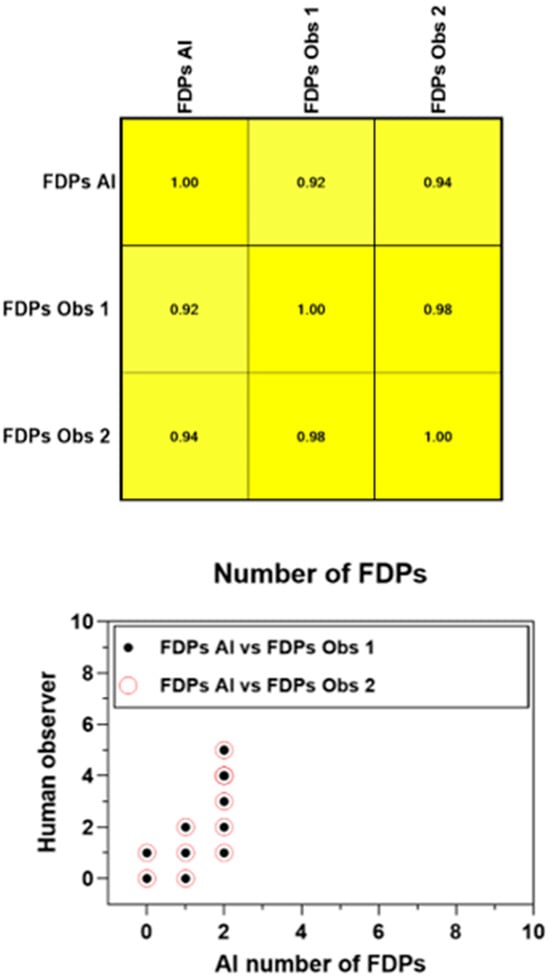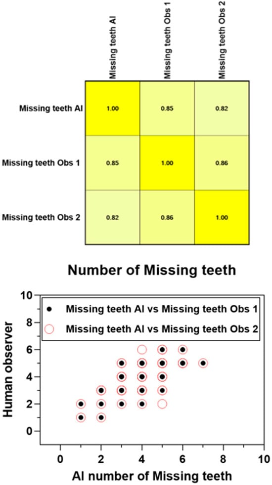 The Pearson product–moment showed a strong correlation (R > 0.5) between the perception of the AI and the perceptions of observer 1 and observer 2 for all structures that were identified in the periapical radiograph. For the number of teeth with caries, the AI correlation was found to be 0.70–0.73 (Figure 1 and Figure 2). This demonstrates the AI’s capability to accurately detect caries, which is critical for early diagnosis and intervention. For the number of implants, the AI correlation was found to be 0.97–0.98 (Figure 3 and Figure 4). This near-perfect agreement showcases the AI system’s proficiency in identifying implants, which is vital for patient treatment planning and follow-up. For the number of teeth with fillings, the AI correlation was found to be 0.85–0.89 (Figure 2 and Figure 5). This strong correlation, reflecting the AI’s accuracy in detecting dental restorations, is essential for assessing the integrity and longevity of dental restorative treatments. For the number of teeth with fixed prostheses, the AI correlation was found to be 0.92–0.94 (Figure 4 and Figure 6), while that for the number of missing teeth was found to be 0.82–0.85 (Figure 7). These capabilities of the AI system are crucial for comprehensive dental evaluations and indicate a high level of reliability in identifying edentulous areas, which is important for treatment planning and prosthetic considerations.