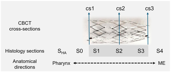 Imaging of the heads followed directly after the 5th GA, which ended with the euthanasia of the sheep and the separation of the head from the body. The animals’ heads were put on ice and sent to CBCT. The CBCT scans (3D Accuitomo 170, J. Morita Mfg. Corp., Kyoto, Japan) were collected as an overview and detailed images for both sides (mode: CT, 360°; device settings: HiFi and HiRes imaging; 170 × 120 and 60 × 60, respectively). The software 3D Slicer [37] (https://www.slicer.org/; version 4.11.20210226; assessed on 17 March 2022) was used to analyze the DICOM files in terms of the position of the stent and its shape. The maximal and orthogonal cross sections (cs) were measured at both ends and the center of the stent (cs1—directed to the ET entrance/pharyngeal orifice; cs2—the middle; cs3—directed to the ET isthmus). The position of the cross sections matches the position of the histological sections S1, S2, and S3 (see Figure 1). The total length of the stent, including the radiographic markers, was also determined. The middle ear was assessed in terms of whether it was free, ventilated, partially filled, or completely filled with tissue and/or fluid.