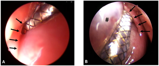 Stenting was successful in eight out of eight cases and conducted always by the same surgeon. However, the ET was difficult to access due to the accumulation of clear secretions, the associated poor visibility, and protruding mucosa (Figure 2A,B).