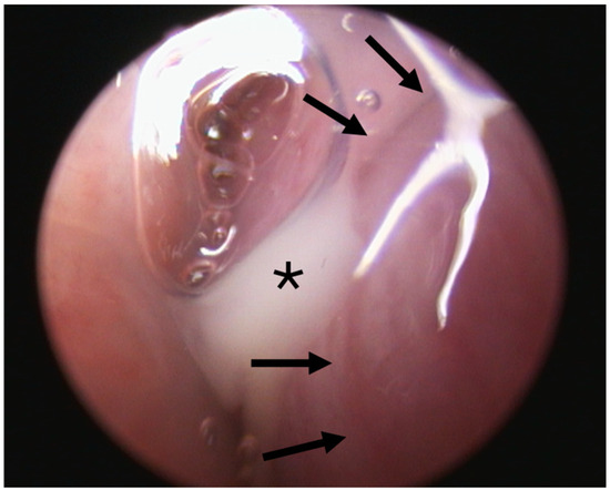 ET opening (left side) of animal A6 during the 3rd GA prior to stent insertion with abnormal secretion (asterisk) associated with the ET lumen. Arrows indicate the ET opening.