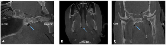 CBCT of animal A1. Ventilated stent in longitudinal (A,B) and cross section (C) of the sheep skull indicated by blue arrows.