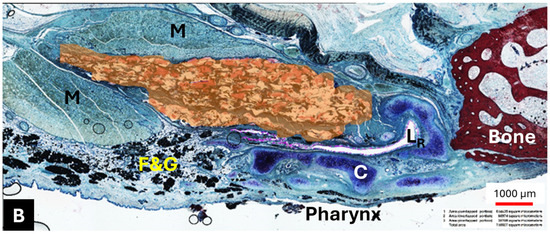 The location of the HA depot (colored in orange) in animal A4 on the stent ((A) mirrored view) and control side (B) for section S2. M—muscle; F&G—fat and glandular tissue; C—ET cartilage; LS—stent lumen; LR—residual ET lumen; red circle—approximating the stent struts. The black dots in the vicinity of the circle are the stent struts.