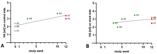 Pearson correlation indicated that the HA injection volume and the time needed to regain physiological type A tympanogram are correlated for the control side (r = 0.8173; p = 0.0248). Animals A1, A6, and A5 with lower HA volumes already had type A tympanogram in week 0, whereas animals A8 and A4 had measured type A tympanograms in weeks 3 and 10 (Figure 8A). On the stent side, no correlation (r = 0.4220; p = 0.3457) between the injected volume and the week of re-ventilation of the middle ear was found (Figure 8B).