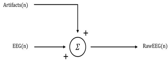 Regression-based methods are the simplest and most traditional methods for removing ocular artifacts from EEG signals [,,]. These methods are applied under a linearity assumption, that is, the assumption that each signal is the cumulative sum of the brain signal and artifacts. Thus, the total signal can be described as the linear and time-invariant combination of these contributions, as illustrated by Formula (1) and Figure 2 [,].