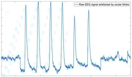 Raw EEG signal affected by ocular artifacts. Such artifacts can be easily visually recognized as the prominent peaks visible along the signal trace.