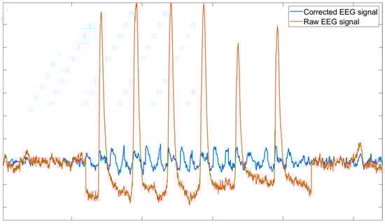 Overlapped representation of the raw (orange line) and clean (blue line) EEG signals. The figure shows how the algorithm successfully identified and corrected the ocular artifacts.