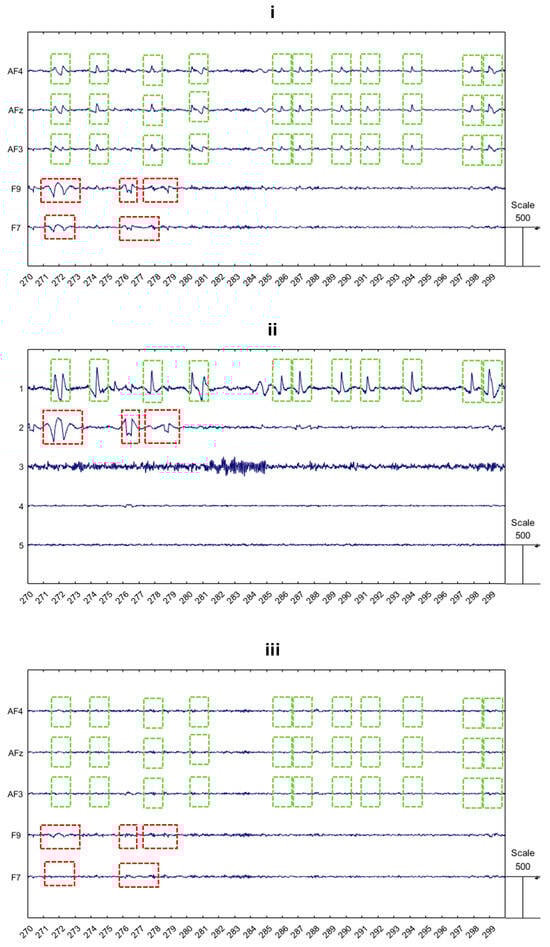 Example of ICA’s performance in removing ocular artifacts. The presented plots show: (i) the raw EEG from frontal electrodes; (ii) the first five components from ICA, ordered by energy; and (iii) the clean EEG from the same electrodes after removing the artifactual components (specifically, the first and second components). Green rectangles highlight blink patterns in both the raw EEG and the ICA components, while red rectangles indicate saccade patterns. After cleaning the EEG signal, these rectangles no longer contain artifact patterns, demonstrating the effectiveness of the artifact removal process.