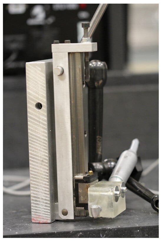 The testing procedure was carried out according to Rugova and Abboud 2024 []. A custom-built drill press with a W&H implant motor (W&H Group, Bürmoos, Austria) was used to ensure a standard, unbiased drilling procedure for each osteotomy (Figure 1). Ten mm-deep osteotomies were drilled into artificial bone similes (BS180035-120035-180035, BoneSim, Cassopolis, MI, USA) to ensure drilling occurred in a standardized bone medium to prevent results from being influenced by inconsistent bone densities. A high-precision Computer Numeric Control (CNC) machine was used both to cut the BoneSims and to mark each osteotomy site. The BoneSim strips were soaked in room temperature saline for 20 min prior to drilling to simulate a more fluid environment. External irrigation at a flow rate of approximately 12 mL/min was used throughout while an infrared camera (FLIR A325sc infrared camera, FLIR Systems Inc., Wilsonville, OR, USA) fixed with a close-up 4× lens acquired temperature data from the surface of the bone 0.5 mm away from the final osteotomy. Figure 2 shows a still image taken with the infrared camera of the largest drill bit used in this study in front of the bone simile in a dynamic rainbow palette.