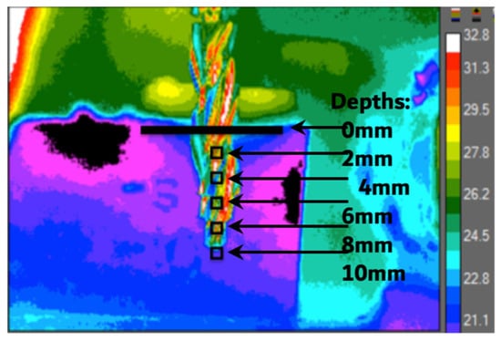 Thermal video recordings were analyzed to document the maximum temperature readings at 5 regions of interest, at depths of 0, 2, 4, 6, 8, and 10 mm, 0.5 mm away from the periphery of the osteotomy throughout the duration of the procedure.