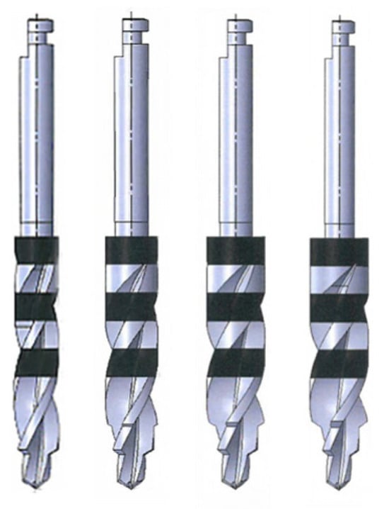 - Abboud, M.; Delgado-Ruiz, R.A.; Kucine, A.; Rugova, S.; Balanta, J.; Calvo-Guirado, J.L. Multistepped Drill Design for Single-Stage Implant Site Preparation: Experimental Study in Type 2 Bone. Clin. Implant Dent. Relat. Res. 2015, 17 (Suppl. 2), e472–e485. [Google Scholar] [CrossRef]