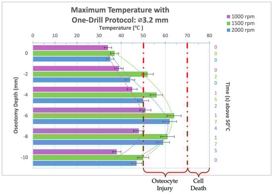 Bar graph showing maximum temperatures reached when drilling into bone to a depth of 10 mm with the 3.2 mm-diameter drill bit at a load of 2.3 kg and three different spindle speeds (1000, 1500, and 2000 rpm). Temperature range of bone cell injury and bone cell death are marked on graph. Left axis shows drilling depth (mm) while top axis shows maximum temperature reached (°C) at that depth. Right axis shows duration (seconds) temperatures exceeded 50 °C.