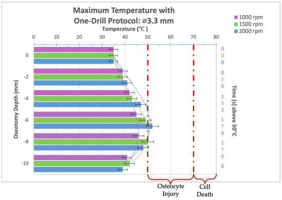 Bar graph showing maximum temperatures reached when drilling into bone to a depth of 10 mm with the 3.3 mm diameter drill bit at a load of 2.3 kg and three different spindle speeds (1000, 1500, and 2000 rpm). Temperature range of bone cell injury and bone cell death are marked on graph. Left axis shows drilling depth (mm) while top axis shows maximum temperature reached (°C) at that depth. Right axis shows duration (seconds) temperatures exceeded 50 °C.