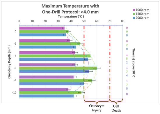 Bar graph showing maximum temperatures reached when drilling into bone to a depth of 10 mm with the 4.0 mm diameter drill bit at a load of 2.3 kg and three different spindle speeds (1000, 1500, and 2000 rpm). Temperature range of bone cell injury and bone cell death are marked on graph. Left axis shows drilling depth (mm) while top axis shows maximum temperature reached (°C) at that depth. Right axis shows duration (seconds) temperatures exceeded 50 °C.