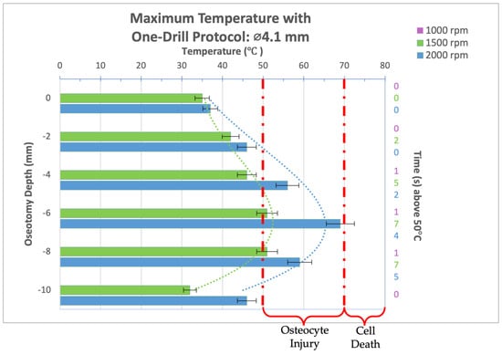 Infrared video recordings taken during the osteotomy procedure for a 4.1 mm diameter drill bit used in a one-drill protocol were analyzed and maximum temperatures at osteotomy depths of 0, 2, 4, 6, 8, and 10 mm were recorded and organized into the bar graph seen in Figure 7. The 1000 rpm group is not shown as this spindle speed was too low for the drill bit to penetrate the cortical portion of the bone present without increasing the load. The 1500 rpm group reached 51 °C for 1 and 2 s at an osteotomy depth of 6 and 8 mm, respectively; however, the reversible cellular injury expected is biologically mild and insignificant. The peak temperatures reached at 2000 rpm also indicate reversible cellular injury limited to the immediate surrounding bone of the implant bed at a depth of 4, 6, and 8 mm. At a depth of 6 mm at 2000 rpm, 69 °C is reached just brushing the threshold for immediate cell death.