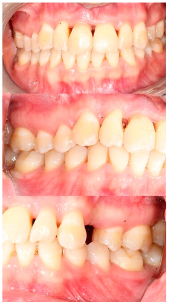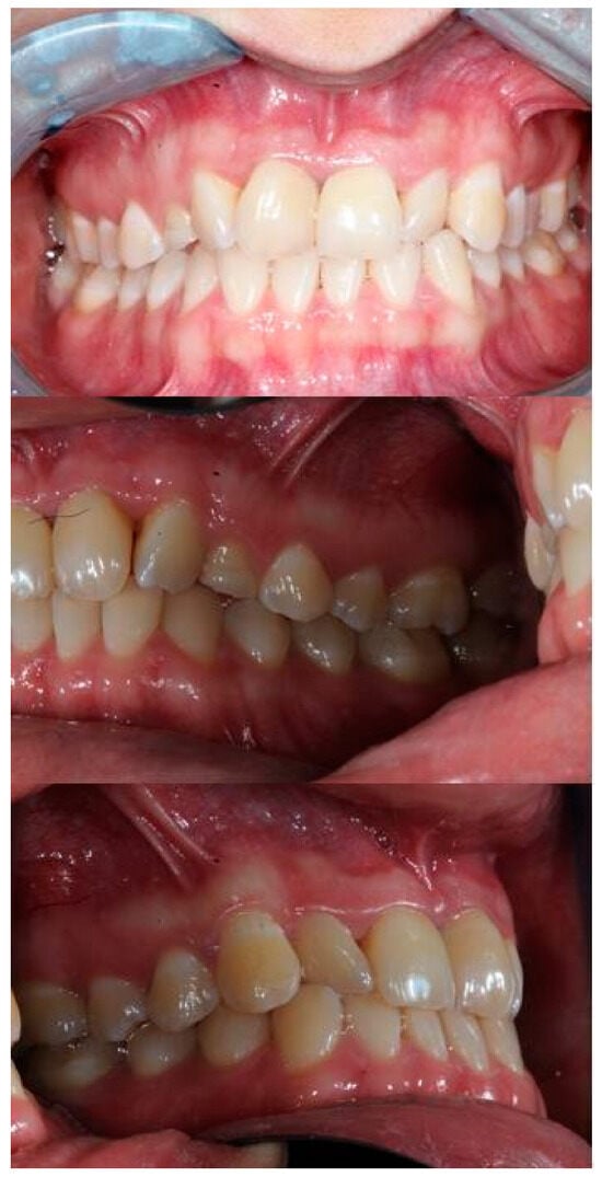 The use of this hybrid anchoring system, dental and on screws, allows to reduce the forces exerted on the supporting teeth. The device had a palatal arm that could be activated with an eyelet to be able to tie the elastic traction. The day after screw insertion, the right screw showed mobility and was removed. The stability of the device was considered valid, therefore, the screw was not replaced. The impacted canine was surgically exposed, and a button was bonded to the crown with a chain for traction under cover. The orthodontic treatment lasted from September 2019 to December 2022. When the impacted canine appeared in the palate, in March 2021, the orthodontic brackets were bonded to the teeth of the upper arch, except for the two left premolars in good occlusion. In the right sector of the anterior area, it was necessary to improve the alignment and increase the space for the right canine. The orthodontic brackets were applied from canine to canine and on the right premolars to distribute the orthodontic forces, always applied with the lowest possible intensity. The aim was to improve alignment, resolve the cross bite of the left lateral incisor, and position the right canine along the dental arch. For the therapy, round section wires were used, starting with preformed Nickel Titanium .012″ archwires and then progressively .014″ and .016″, ending with a .016″x.022″ stainless steel archwire only after aligning teeth. The archwires were tied to the brackets using short .010″ metal ligatures, tightened progressively until the desired tooth movement was completed. In October 2022, during the last stages of orthodontic therapy, the patient reported pain and mobility of the upper left first premolar not included in the orthodontic appliance. An incomplete tooth fracture, a mesio-distal crack that extended occlusogingivally into the root was diagnosed by endodontist using a dental operating microscope (LABOMED, Los Angeles, CA, USA). Since the patient was seen once a month, the periodontal damage occurred quickly, and the tooth had to be extracted [31]. The first left premolar was not included in the orthodontic appliance, but it had a good relationship with the antagonist and had never shown clinical signs during the treatment period. The speed of bone destruction can be traced back to the patient’s characteristics, highlighted by genetic analyses. Unfortunately, in these cases, the most suitable therapy is the extraction of the fractured tooth. The patient completed orthodontic treatment and was referred to the periodontist to maintain her periodontal health, which was at risk due to her diabetes (Figure 5).