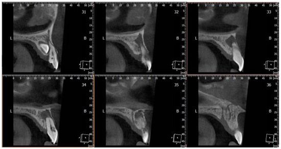 A cone beam computed tomography (CBCT) scan of the dental arches was requested to evaluate the position of the impacted canine. The radiographic examination showed the presence of the impacted canine in a palatal position, also allowing the cervical resorption of the root of the right upper central incisor to be revealed and assessed to be ECR Class 3 [23] (Figure 2).