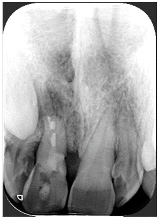It was hypothesized that a possible genetic variation could favor the damage to the integrity of the incisor as for external root resorption and multiple idiopathic cervical root resorption [24,25,26,27] and in this case, interleukin and VDR receptor genes were evaluated. Therefore, DNA was collected using an oral brush. At the same time, a series of biological samples were collected from the deepest periodontal pocket in each quadrant of the dentition using sterile paper points to identify and quantify periodontal pathogens, and the sample was sent to the laboratory. Written informed consent, including information about the diagnostic procedures and genetic testing, was obtained from the patient before her participation in the study and biological sampling. Awaiting the results of molecular testing, the endodontist took care of the patient, who treated the central incisor with cervical resorption. Subsequently, the patient returned to the orthodontist to plan and implement the disinclusion of the palatal canine. Regarding the cervical resorption of 1.1, the surgical approach was excluded due to the location of the defect, and consequently, an intentional reimplantation was performed [20]. After anesthesia, extraction forceps were used to gently extract the incisor. Under the microscope, holding the tooth with a gauge, all the granulation tissue was removed with a diamond bur, and the defect was filled with a composite material. Then, a retro-preparation until ECR was carried out with a diamond bur and ultrasonic endodontic tip specific for surgical endodontics and filled with MTA. A socket curettage was completed, rinsed with saline solution, and then, the tooth was reimplanted and held under finger pressure before being stabilized with a flexible splint for 2 weeks [28] (Figure 3).