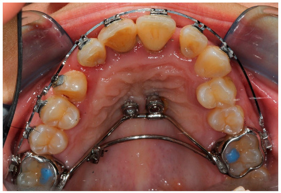 From the results of the genetic analysis of interleukins, the patient was judged to be at risk of root resorption. Furthermore, the results of the genetic analysis on the bacterial load suggested prudence and attention in checking the periodontium of the teeth on which the orthodontic appliance would be applied, in addition to planning the periodontal therapy. For this reason, in the orthodontic therapy project, we reduced the forces on the anchoring teeth of the appliance. A device anchored on molar bands on the upper first molars and two palatal screws (Dentaurum, Ispringen, Germany) was constructed, the positioning of which occurred using a surgical guide (Figure 4).