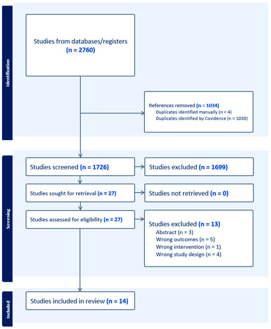 The search strategy resulted in 1726 studies after excluding 1034 duplicates. These studies were screened by title and abstract for eligibility, and 1699 studies were excluded for irrelevancy. The remaining 27 studies were screened by full text. Four studies were excluded due to being the wrong design, three were excluded for being abstracts without a full text, and six were excluded for using ICGA for the wrong intervention. This left a total of 14 syntheses: 8 systematic reviews (SRs) and 6 meta-analyses (MAs). A PRISMA flow diagram is shown in Figure 1.