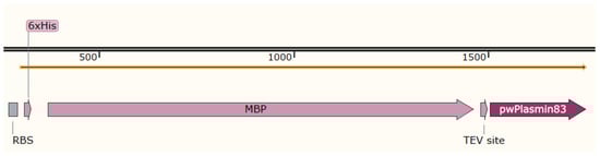 Schematic representation of the complete protein structure to be expressed (MBP is the maltose-binding protein tag, TEV is the TEV cleavage site of the protease, and pwPlasmin83 is the 83AA to be expressed).