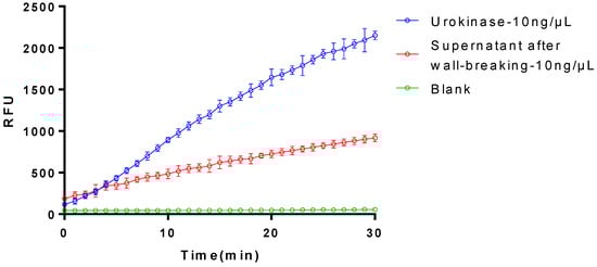 Comparison on the activation of plasminogen between urokinase and the purified plasminogen activator. Supernatant after wall-breaking refers to the liquid that remains on top after the cell walls have been broken or lysed. The data represent mean ± SD, n = 3.