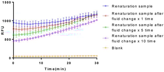 Influence on the activation of plasminogen by purification via denaturation of the isolated plasminogen activator in the inclusion body from E. coli. the sample that has been refolded is then referred to as “Renaturation sample”. Renaturation sample after fluid change ×1 time: the sample after renaturation that has undergone one single fluid change treatment. Renaturation sample after fluid change × 5 time: the sample after reconstitution that has undergone 5 rounds of fluid change treatment. Renaturation sample after fluid change × 10 time: the sample after reconstitution that has undergone 10 rounds of fluid change treatment. The data represent mean ± SD, n = 3.