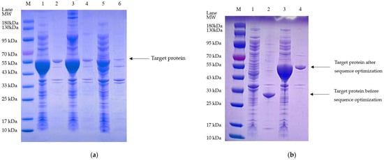A measure of 200 mL of LB (Kana) liquid medium was added to a sterile 1000 mL flask within an ultra-clean workbench, and 10 mL of seed solution was inoculated, followed by incubation at 37 °C with 200 rpm oscillation. Inducer IPTG was then added to the medium at OD600 between 0.6 and 0.8, setting the final concentrations to 0.2 mM (after overnight incubation at 25 °C) and 0.8 mM (after overnight incubation at 37 °C), respectively. On a subsequent day, the bacterial solution was transferred into a centrifuge cup and centrifuged at 4 °C for 15 min at 12,000 rpm to collect the bacterial bodies. The collected bacteria were resuspended in 20 mM Tris-HCl pH 8.0 to a concentration of 25 mg/mL and subjected to a high-pressure homogenizer (Antos Nano Science and Technology, Suzhou, Jiangsu, China, AH-MINI) for homogenization and breaking at 4 °C under 800~900 bar for three cycles. One milliliter of the broken bacteria was then placed into a 1.5 mL centrifuge tube, centrifuged at 12,000 rpm at 4 °C for 10 min in a floor-standing high-speed freezing centrifuge (Hunan Kecheng Instrumentation Machinery, Changsha, Hunan, China, H6-10KR), and the upper layer of the supernatant was extracted and mixed with 1 mL of 20 mM Tris-HCl pH 8.0 (Table 1), before being transferred into the SDS-PAGE solution for further analysis.