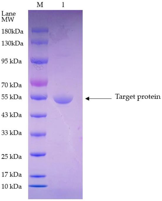 According to the results by SDS-PAGE, the purified optimized plasminogen activator (52.9 kDa) was gained by the nickel column without redundant bands, which indicated the remarkable efficacy of the purification of the target protein (Figure 8). Further quantitative analysis revealed that the concentration of the purified plasminogen activator is approximately 2 mg/mL, which provided high-quality samples for subsequent experiments.